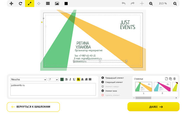 Онлайн-редактор визиток, который предлагает готовые решения. Можно сохранить работу в PDF или отправить на e-mail.