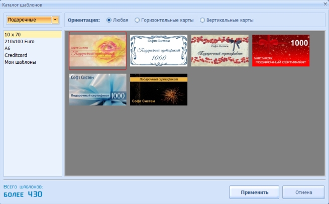 Сначала скачайте и установите программу на компьютер. Чтобы сделать подарочный сертификат, выберите «Шаблоны визиток». В выпадающем меню укажите «Подарочные», и подберите подходящий размер. Выберите понравившийся макет и нажмите «Применить». Также можно скачать бесплатно шаблоны подарочного сертификата.