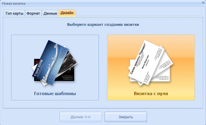 При необходимости макет можно редактировать или выбрать красивый и пустой шаблон. Если вы приняли решение сделать сертификат с нуля, то выберите пункт «Новая визитка». Нажмите «Далее» и введите размер будущей подарочной карты. Укажите, что делаете визитку с нуля и подберите макет.